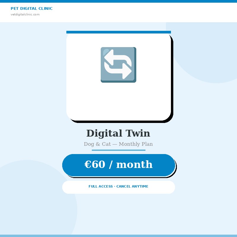 The complete Digital Twin for your dog or cat — paid monthly. Same full access, same 236 veterinary parameters, same certified health record. €60 a month. No long-term commitment. Because protecting your animal’s health shouldn’t require a financial leap of faith.