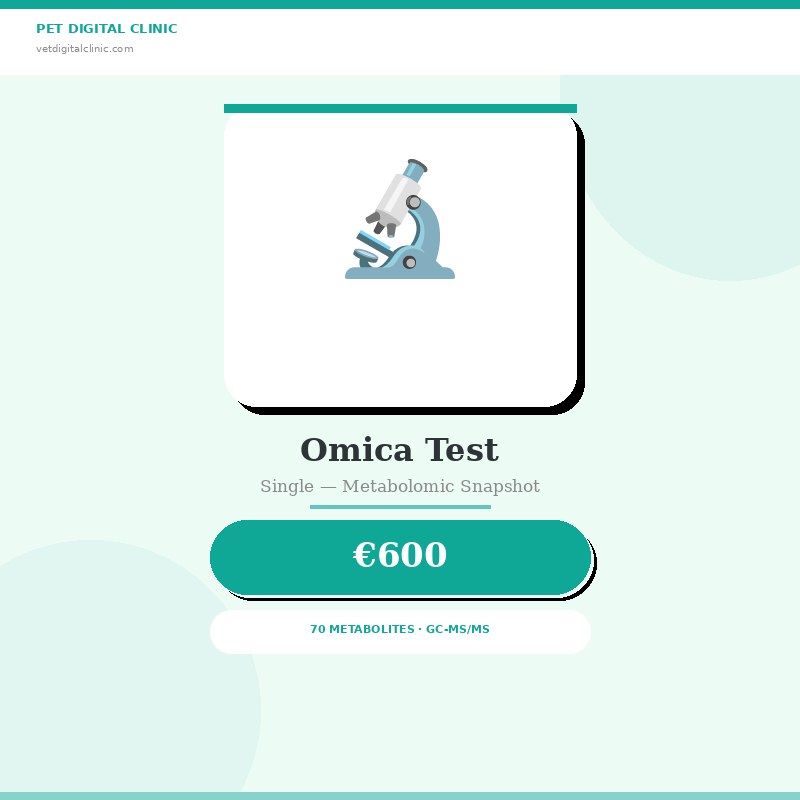 The Omica Test is a single metabolomic analysis of your animal’s urine, conducted in an ISO-certified laboratory using GC-MS/MS (Gas Chromatography–Tandem Mass Spectrometry) and LC-MS/MS (Liquid Chromatography–Tandem Mass Spectrometry) technology. The same analytical instrumentation used in human cancer diagnostics. Applied, for the first time in Italy at this level, to veterinary medicine.
